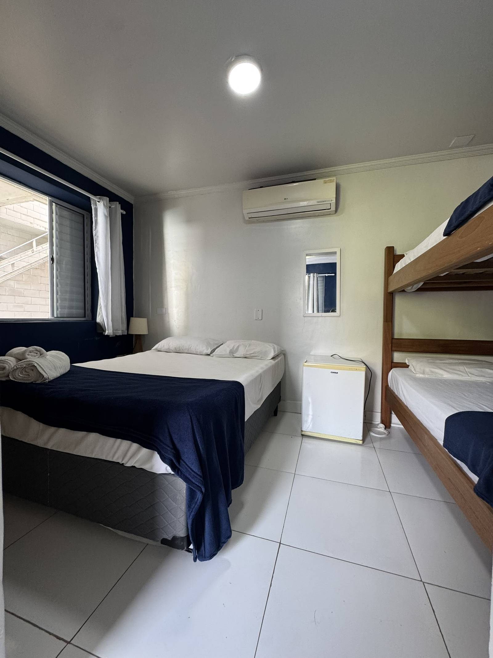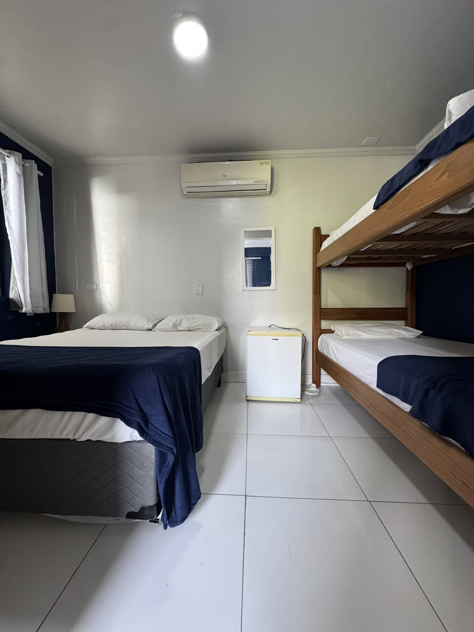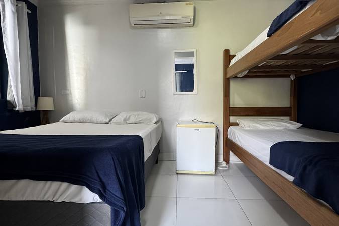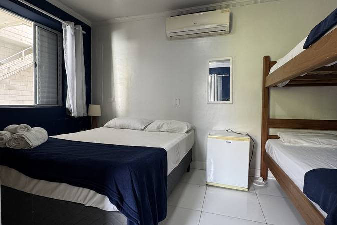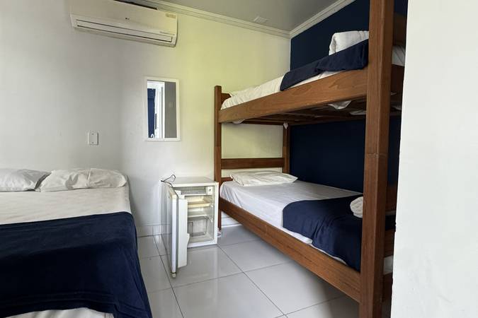 A acomodação Externa Térreo Família é perfeita para grandes grupos, hospedando até 05 pessoas em uma cama casal, um beliche e mais uma cama solteiro, e com as seguintes comodidades: