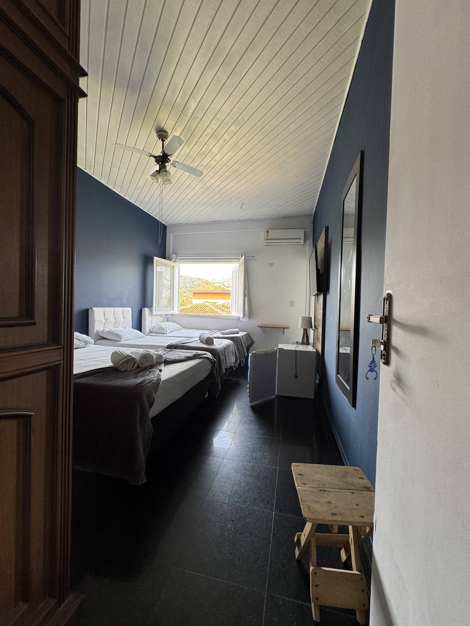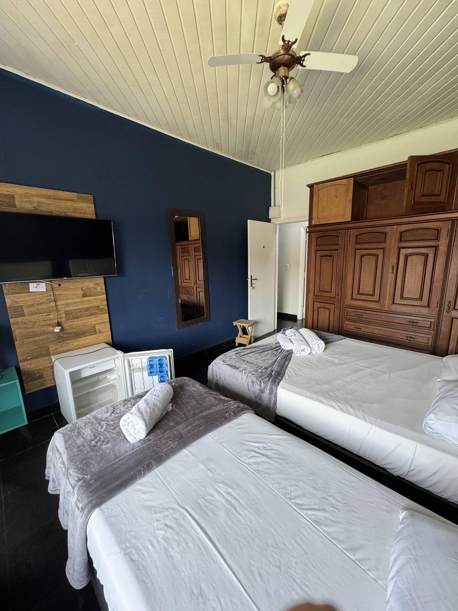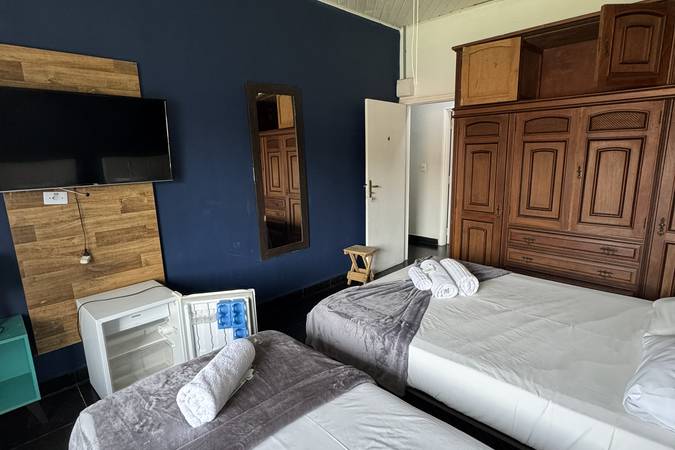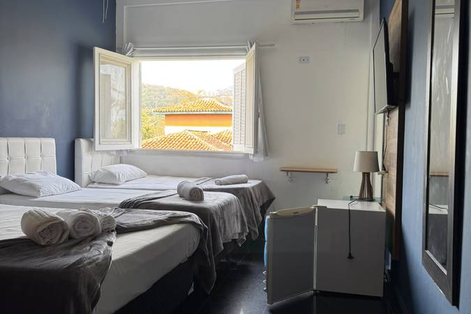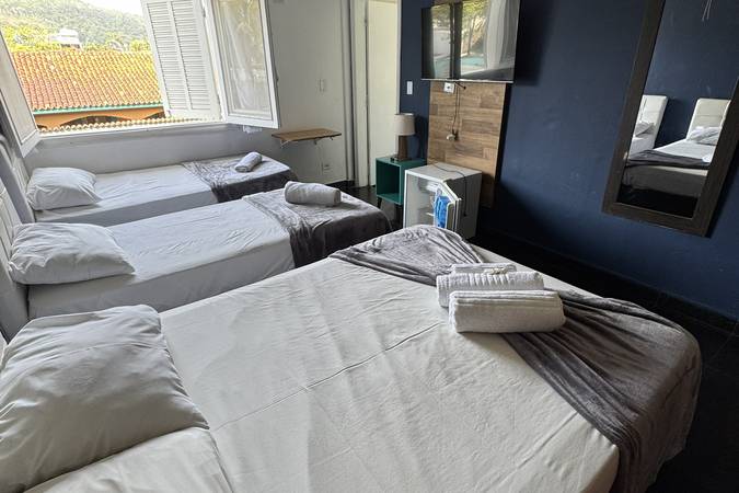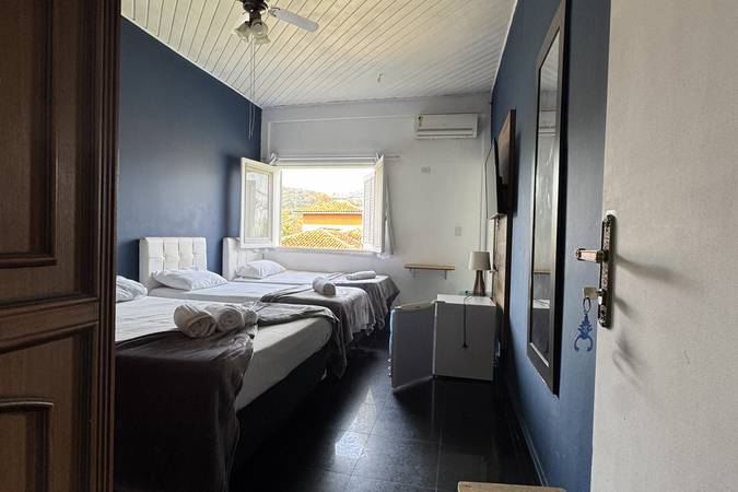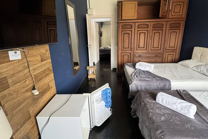 O quarto Home Superior Quádruplo hospeda até 4 pessoas, sendo o Quarto 4 do nosso hotel, com uma camas casal + duas camas solteiro, com conforto e com as seguintes comodidades:
